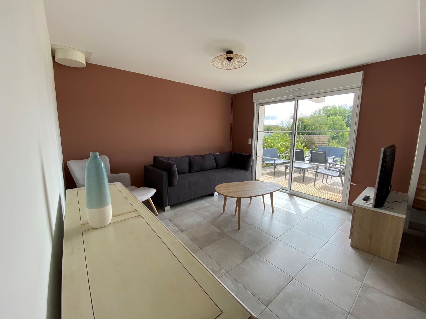 Salon avec téléviseur écran plat. Grandes baies vitrées donnant sur la terrasse en bois avec mobilier de jardin.